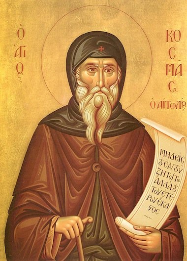 Ὡς φωστὴρ νεόφωτος τὴν Ἐκκλησίαν, καταυγάζεις ἅπασαν, Εὐαγγελίου διδαχαῖς, Κοσμᾶ Χριστοῦ Ἰσαπόστολε· διὸ ἀξίως γεραίρει τὴν μνήμην σου.