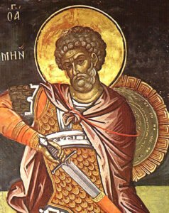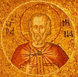 Τῆς στρατείας ἥρπασε, σὲ τῆς προσκαίρου, καὶ ἀφθάρτου ἔδειξε, συγκληρονόμον ὦ Μηνᾶ, σὺν τοῖς συνάθλοις σου Κύριος, ὁ παρασχών σοι τὸν ἄφθαρτον στέφανον.
