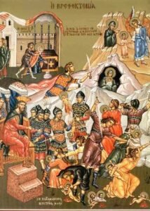 Ὡς θύματα δεκτά, ὡς νεοδρεπτα ρόδα καὶ θεία ἀπαρχή, καὶ νεοθυτοι ἄρνες, Χριστῷ τῷ ὥσπερ νήπιον, γεννηθέντι προσήχθητε, ἁγνὰ Νήπια, τὴν τοῦ Ἡρῴδου κακίαν, στηλιτεύοντα καὶ δυσωπούντα ἀπαύστως, ὑπὲρ τῶν ψυχῶν ἠμῶν.