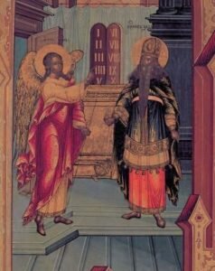 Ὁ Ζαχαρίας ἦταν ἱερέας. Τὴν ὥρα τοῦ θυμιάματος μέσα στὸ θυσιαστήριο, εἶδε ἄγγελο Κυρίου, ποὺ τοῦ ἀνήγγειλε, ὅτι θὰ ἀποκτοῦσε γιὸ καὶ θὰ ὀνομαζόταν Ἰωάννης. Ὁ Ζαχαρίας σκίρτησε ἀπὸ χαρά, ἀλλὰ δυσπίστησε. Ἡ γυναῖκα του ἦταν στεῖρα καὶ γριά, πῶς θὰ γινόταν αὐτὸ ποὺ ἄκουγε;
