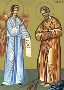 Ὀ Ἡρώδης ἔβαλε τούς Ἰουδαιους καί συνέλαβαν τόν Ἀποστολο Πετρο κατά τίς ἡμερες τῆς ἐορτης τῶν ἀζύμων. Καί ὀταν τόν ἐπιασε, τόν ἔβαλε στήν φυλακη. Τήν νυκτα, πρίν τήν ἡμερα κατά τήν ὁποία ὀ Ἡρώδης ἔμελλε νά τόν παρουσιασει στόν λαό, ὀ Ἀπόστολος Πέτρος κοιμόταν μεταξὺ δύο στρατιωτῶν καί φρουροὶ φύλαγαν μπροστα στό κελί του. Ξαφνικὰ ἦλθε Ἄγγελος Κυρίου καί ἔλαμψε φῶς στό κελί. Ἀφοῦ κτύπησε τήν πλευρα τοῦ Πέτρου, τόν ξύπνησε καί τοῦ εἶπε: «Σηκω γρήγορα». Καί ἔπεσε ἡ ἁλυσίδα ἀπὸ τά χέρια του.