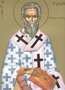 Θείας ἔτυχες, ἱερατείας, νεύσι κρείττονι, ἐκλελεγμένος, ὡς θεράπων τῆς Τριάδος ἐπάξιος· σὺ γὰρ τῶν ἔργων ἐκλάμπων ταῖς χάρισι, τὴν Ἐκκλησίαν ἐστήριξας θαύμασι. Τύχων Ὅσιε, Χριστὸν τὸν Θεὸν ἱκετευε, δωρήσασθαι ἡμῖν τὸ μέγα ἔλεος.