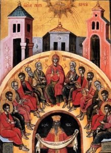Τὴν ἡμέρα τῆς Πεντηκοστῆς τὸ Ἅγιο Πνεῦμα κατῆλθε ἐξ οὐρανοῦ στὸ Θεανθρώπινο σῶμα τῆς Ἐκκλησίας καὶ γιὰ πάντα παρέμεινε σὲ Αὐτὸ σὰν Πᾶν-Ζωοποιὸς ψυχὴ Αὐτοῦ. Αὐτὸ τὸ ὁρατὸ θεανθρώπινο σῶμα τῆς Ἐκκλησίας συγκροτοῦν οἱ Ἅγιοι Ἀπόστολοι μὲ τὴν πίστη των στὸν Θεάνθρωπο Ἰησοῦ Χριστὸ ὡς Σωτῆρα τοῦ κόσμου καὶ ὡς τέλειου Θεοῦ καὶ ὡς τέλειου ἀνθρώπου. Καὶ ἡ κάθοδος καὶ ἡ σύνολη δρατηριότητα τοῦ Ἁγίου Πνεύματος στὸ Θεανθρώπινο σῶμα τῆς Ἐκκλησίας ἔρχεται ἀπὸ τὸν Θεάνθρωπο καὶ ἐξαιτίας τοῦ Θεανθρώπου.