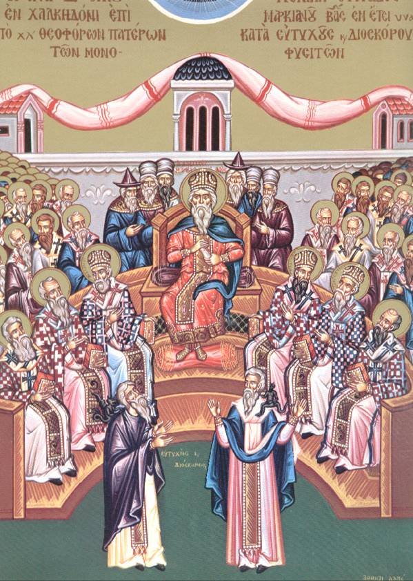 Ἡ τέταρτη οἰκουμενικὴ Σύνοδος ἔγινε στὰ 451 χρόνια μετὰ τὴ γέννηση τοῦ Χριστοῦ στὴ Χαλκηδόνα τῆς Βιθυνίας. Ἐκεῖ συνάχθηκαν 630 Πατέρες τῆς Ἐκκλησίας καὶ καταδίκασαν τὸν ἀρχηγὸ τῆς αἵρεσης τοῦ μονοφυσιτισμοῦ Εὐτυχῆ καὶ τοὺς ὀπαδούς του. Μονοφυσιτισμὸς εἶναι ἡ αἵρεση καὶ ἡ πλανεμένη διδασκαλία, ποὺ παραδέχεται τὸν Ἰησοῦ Χριστὸ μόνο ὡς Θεό. Ἡ Σύνοδος δογμάτισε ὅτι ὁ Ἰησοῦς Χριστὸς εἶναι Θεάνθρωπος, τέλειος Θεὸς καὶ τέλειος ἄνθρωπος, κι ὅπως τὸ ψάλλουμε στὸ Δοξαστικό τοῦ Ἑσπερινοῦ στὸν πλ. δ’ ἦχο, «διπλοῦς τὴν φύσιν, ἀλλ’ οὐ τὴν ὑπόστασιν».